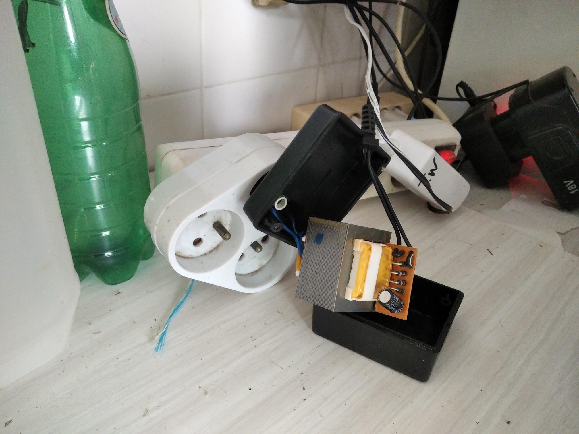 Le vendredi qui a suivi, j’ai trouvé un transformateur 220V-12V complétement éventré, laissé dans la multiprise sous les talkies walkies (voir photo jointe) et j’ai immédiatement prévenu [Identité protégée]. Le boitier plastique d’un tel transformateur est extrêmement robuste car il répond à des normes de sécurité très précises : il ne casse pas si facilement. Quand bien même il casserait pour une raison ou une autre, aucun adulte -- même un abruti -- ne le remettrait complétement éventré dans la prise électrique avec bobine, phase et neutre du 220V apparent. Ce transformateur éventré représentait un message « situationnel, équivoque et déniable » illustrant peut-être un « attention, haute tension » suite à la perte de mon sang froid le lundi précédent. Ou alors une critique du montage électrique que j’avais fait de la LED dans l’algeco sans hublot laissant entendre qu’il serait peu sécuritaire. Ou alors -- et c’est le plus probable -- n’importe quel prétexte pour maintenir l’oppression à un haut niveau par l’envoi de centaines de messages secrets par jour qui sont autant de coup de bâtons pour un homme épuisé. Je précise que cette histoire de transformateur éventré relève presque du sabotage criminel et de la mise en danger volontaire de la vie d’autrui.