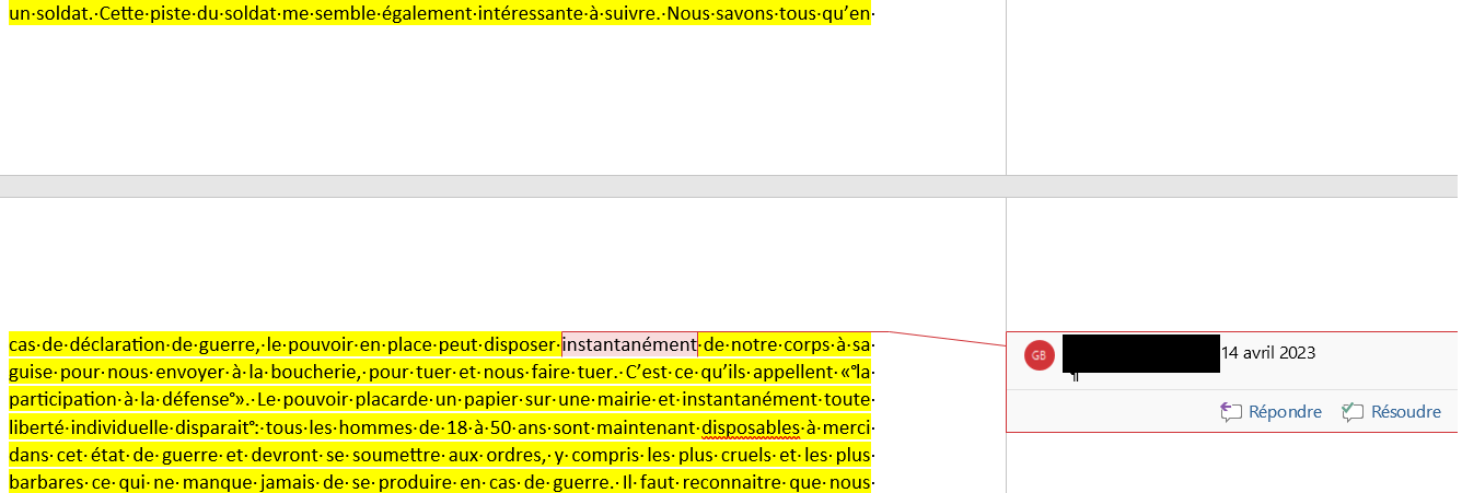 Avant de terminer, je vais rapporter ici une menace qui m’a été faite durant l’écriture de mon analyse de Rousseau Juge de Jean-Jacques. J’écris mes textes avec le logiciel Microsoft Word avant de les convertir manuellement en html. Sous Word, il existe une fonctionnalité de révision qui permet d’insérer des commentaires. Je l’ai utilisée à de nombreuses reprises et donc je la connais très bien : je sais donc aussi que je ne l’utilise plus depuis longtemps. En réouvrant mon texte, il était passé tout seul en mode révision et il y avait un commentaire unique au niveau du mot « instantanément » dans ma phrase « En cas de déclaration de guerre, le pouvoir en place peut disposer instantanément de notre corps ». L’image qui illustre ce commentaire (que je n’ai jamais fait) est placée ci-dessous. J’ai ajouté un rectangle noir sur la partie de droite pour cacher mon nom. Je rappelle ici que mon identité n’est pas dissimulée et peut-être trouvée sur la page « Mon identité ». La raison pour laquelle j’évite de placer mon nom sur ce site web est expliquée dans mes ordres de mission.