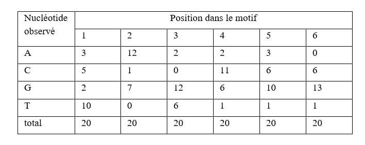 Supposons qu'un facteur de transcription ait été rapporté pour se lier à un motif de 6 pb grâce à 20 observations expérimentales. Une matrice de positions peut résumer les donnés expérimentales (figure 11; matrice 1).