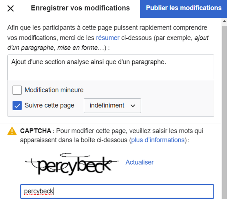 Au cours de cette journée, j’ai également créé un premier lien externe depuis la page wikipedia JCVD (film). Pour cela, j’ai créé un compte wikipedia et modifier la page en question. Voici la photo du captcha qui m’a été proposé :