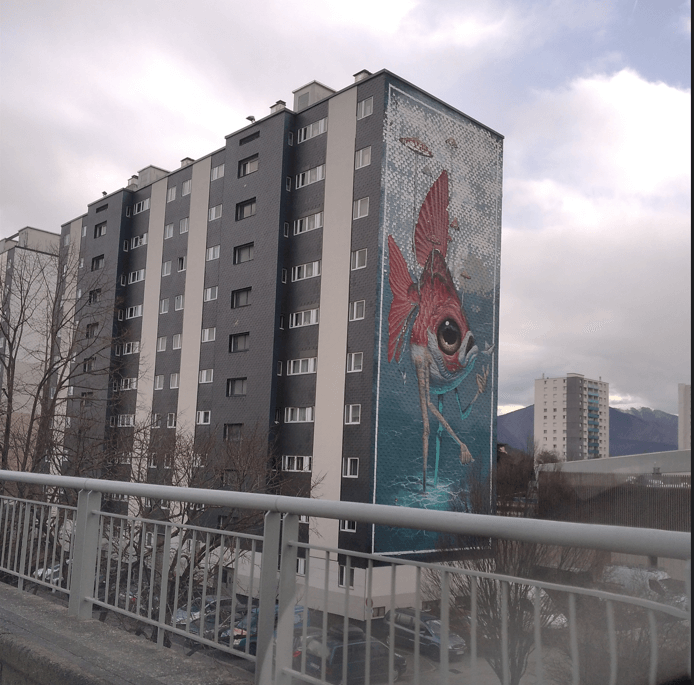 En rentrant chez moi le soir, je suis passé par une route au bord de laquelle il y a un immeuble avec une fresque récente (datant d’il y a quelques années). Il s’agit du dessin d’un poisson sortant de l’océan avec des sortes de pattes. J’ai déjà décrit ailleurs les allusions à l’existence de deux mondes / deux planchers : l’océan avec les poissons (les gens non avertis / non aware qui fonctionnent tel un banc de poisson : on les manipule comme on veut, on leur fait faire ce que l’on veut) et la terre avec les agents et leurs lois secrètes. Le poisson sur patte illustrerait celui que je suis : un poisson capable de sortir la tête de l’eau et de décrire la « terre ». Je ne suis pas certain que cette fresque ait été dessiné uniquement à mon intention (les buts et intentions sont souvent multiples) mais je le soupçonne néanmoins. L’erreur serait de croire que le pouvoir en place autorise un tel dessin sur un immeuble sans qu’il y ait de message réel, de description de la réalité : ce ne serait que de l’art : l’imagination débordante de jeunes artistes. Toute interprétation « noire » relèverait de la paranoïa. Non, il y a toujours un sens et un message caché et personne ne peut peindre une telle fresque sans l’autorisation du pouvoir en place d’une part et sans que cela illustre une réalité, une vérité secrète d’autre part. C’est triste mais c’est la réalité.